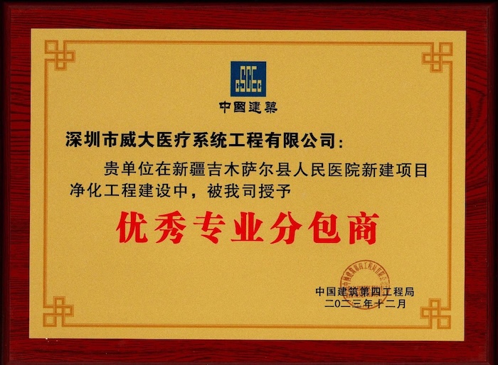 Recently, Shenzhen Weida Medical System Engineering Co., Ltd., a subsidiary of Zhongan Branch, was awarded the honorary title of "Excellent Professional Subcontractor" in the new purification project of Xinjiang Jimusar County People's Hospital. Meanwhile, the Project Department of the Company was awarded as "Excellent Management Team" in the 2023 medical purification project.