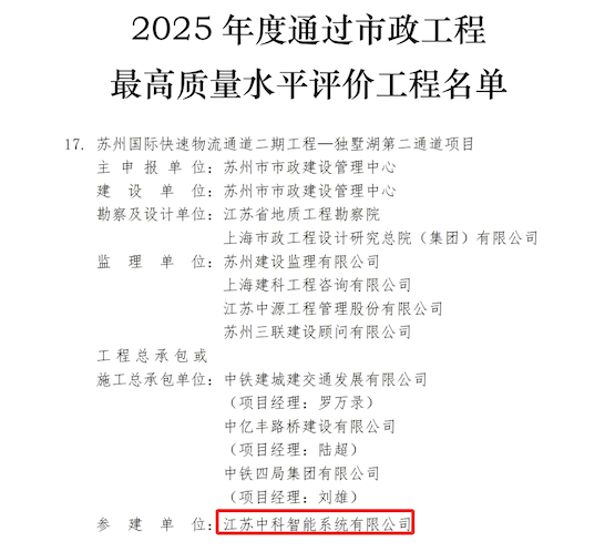 2025年7月22日,中國市政工程協(xié)會(huì)公布評選結(jié)果,中安科子公司江蘇中科智能系統(tǒng)有限公司(以下簡稱“中科智能”)參建的蘇州國際快速物流通道二期工程-獨(dú)墅湖第二通道項(xiàng)目,榮獲2025年度市政工程最高質(zhì)量水平評價(jià)工程。
