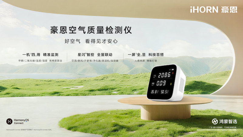 2025年12月1日,鴻蒙智選生態(tài)合作伙伴iHORN豪恩(中安科股份全資子公司)宣布,旗下首款搭載星閃連接的空氣質(zhì)量檢測(cè)儀正式上線華為商城以及華為鴻蒙智家門店。