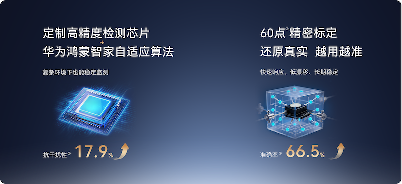 高精度檢測(cè)芯片搭載華為鴻蒙智家自適應(yīng)算法,能對(duì)每一路傳感器信號(hào)做實(shí)時(shí)補(bǔ)償與融合處理,保障傳感器即使處于復(fù)雜環(huán)境下也能穩(wěn)定探測(cè),抗干擾能力提升17.9%*。