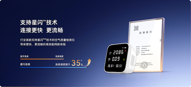 作為業(yè)內(nèi)首款支持星閃連接技術(shù)的空氣質(zhì)量檢測(cè)儀,產(chǎn)品在連接速度、穩(wěn)定性與功耗方面實(shí)現(xiàn)跨越式提升,為用戶帶來更流暢配網(wǎng)體驗(yàn)。