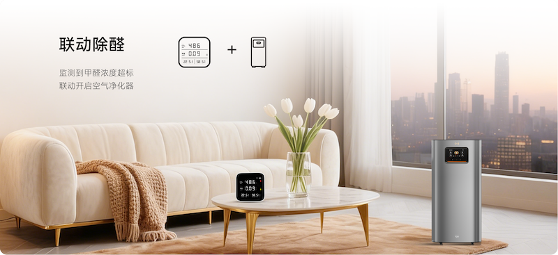 聯(lián)動(dòng)除醛:當(dāng)豪恩空氣質(zhì)量檢測(cè)儀監(jiān)測(cè)到甲醛超標(biāo)時(shí),自動(dòng)聯(lián)動(dòng)空氣凈化器進(jìn)行凈化。新裝修用戶無需頻繁往返開窗,省時(shí)省心。