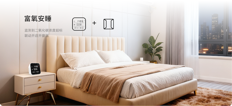 富氧安睡:當(dāng)豪恩空氣質(zhì)量檢測(cè)儀監(jiān)測(cè)到二氧化碳濃度過高時(shí),自動(dòng)聯(lián)動(dòng)開窗器通風(fēng),不影響睡眠,保障整夜富氧環(huán)境。