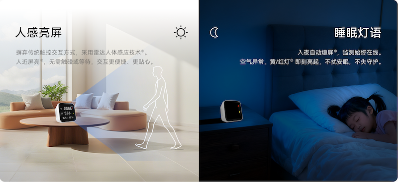 作為首款采用雷達(dá)人體感應(yīng)方案的空氣質(zhì)量檢測(cè)儀,為用戶提供了“人近亮屏、人走熄屏”的人性化無感交互體驗(yàn),大幅提升了產(chǎn)品使用的便捷性。屏幕隨人明滅,拒絕過多的光源分散注意力,助力打造輕松舒適的居家氛圍。