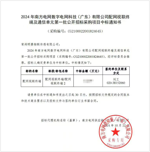 近日,中安科境內(nèi)全資子公司常州明景物聯(lián)傳感有限公司(以下簡(jiǎn)稱(chēng)“明景”)傳來(lái)喜訊,公司在2024年南方電網(wǎng)數(shù)字電網(wǎng)科技(廣東)有限公司配網(wǎng)視聯(lián)終端及通信單元第一批公開(kāi)招標(biāo)采購(gòu)項(xiàng)目中成功中標(biāo)。
